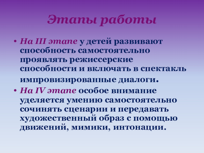 На IV этапе особое внимание уделяется умению самостоятельно сочинять сценарии и передавать художественный образ с помощью движений, мимики, интонации.