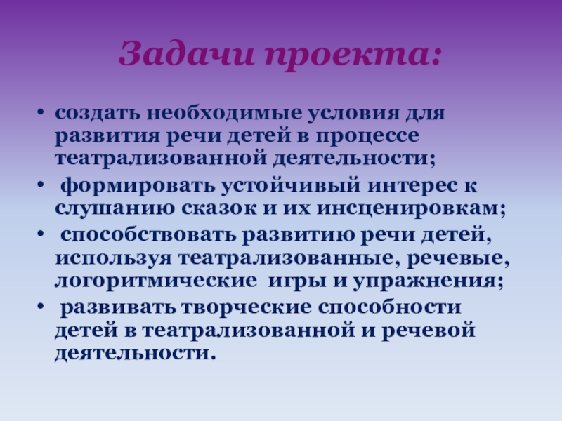 развивать творческие способности детей в театрализованной и речевой деятельности.