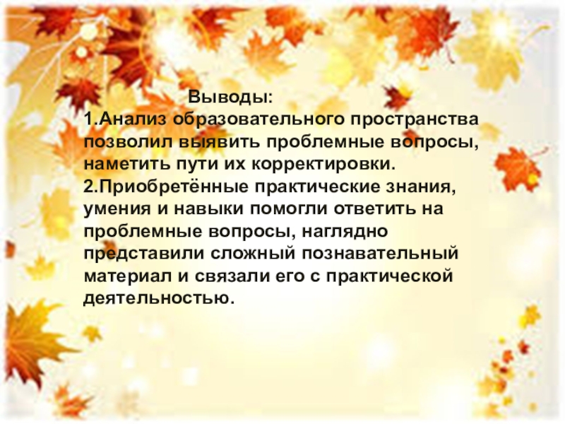 1.Анализ образовательного пространства позволил выявить проблемные вопросы, наметить пути их корректировки.