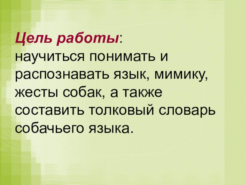 Слайд 3Цель работы: научиться понимать и распознавать язык, мимику, жесты собак, а также