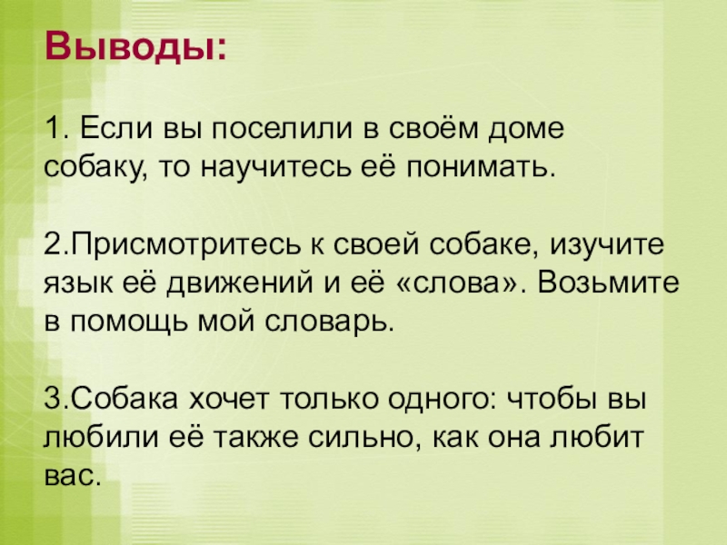 Выводы:  1. Если вы поселили в своём доме собаку, то научитесь её понимать.  2.Присмотритесь к