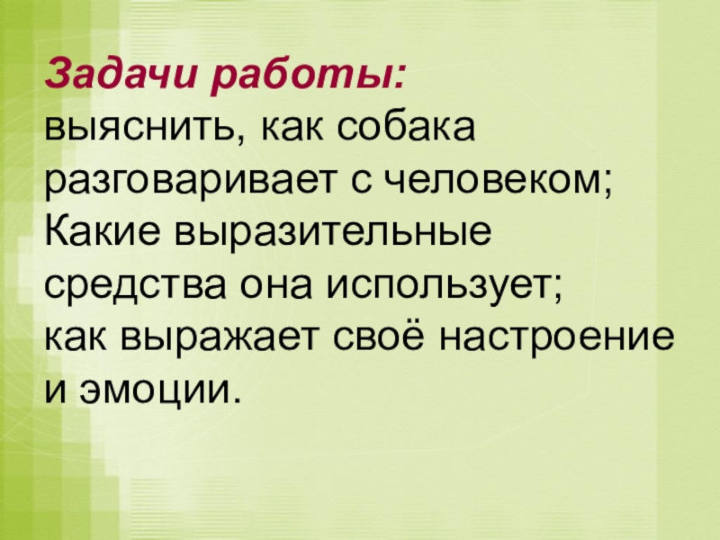Слайд 4Задачи работы: выяснить, как собака разговаривает с человеком; Какие выразительные средства она