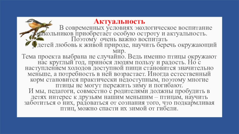 Тема проекта выбрана не случайно. Ведь именно птицы окружают нас круглый год, принося людям пользу и радость. Но с наступлением холодов доступной пищи становится значительно меньше, а потребность в ней возрастает. Иногда естественный корм становится практически недоступным, поэтому многие птицы не могут пережить зиму и погибают.