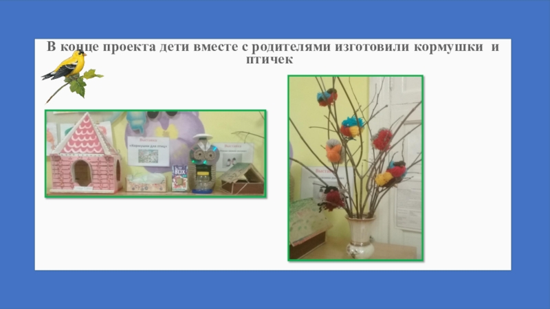 Слайд 15В конце проекта дети вместе с родителями изготовили кормушки и птичек