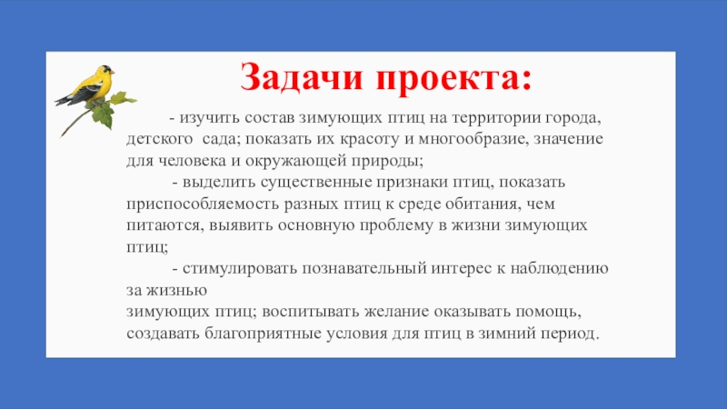 Задачи проекта:           - изучить состав зимующих птиц на территории города, детского  сада; показать