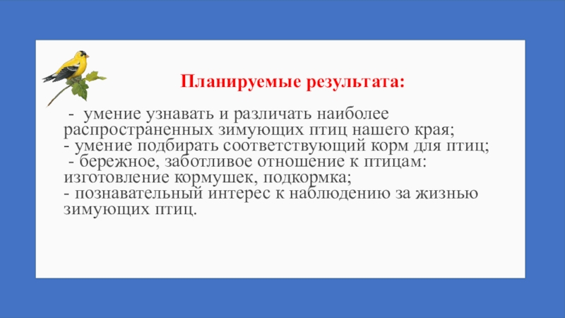 Планируемые результата: -  умение узнавать и различать наиболее распространенных зимующих птиц нашего края;- умение подбирать соответствующий корм