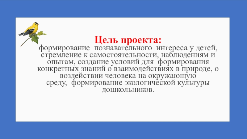 Цель проекта:формирование познавательного  интереса у детей, стремление к самостоятельности, наблюдениям и опытам, создание условий для  формирования конкретных знаний