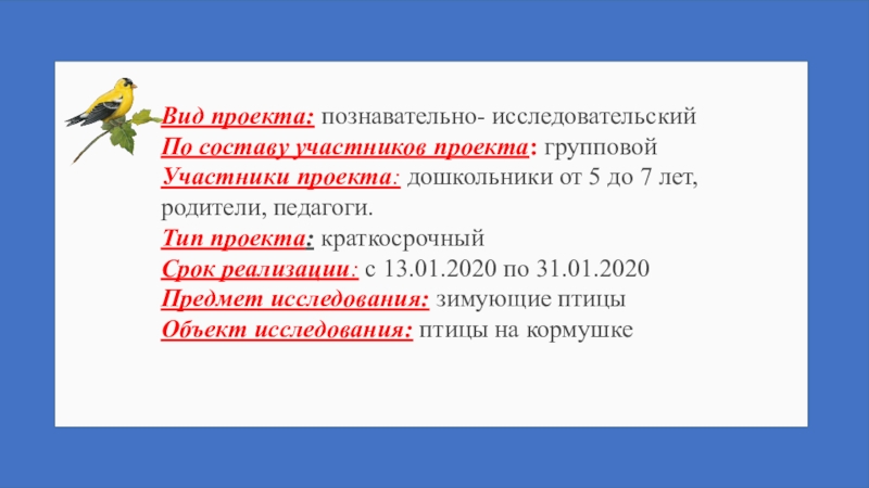 Слайд 1 Проект «Трудно птицам зимовать, нужно птицам помогать»