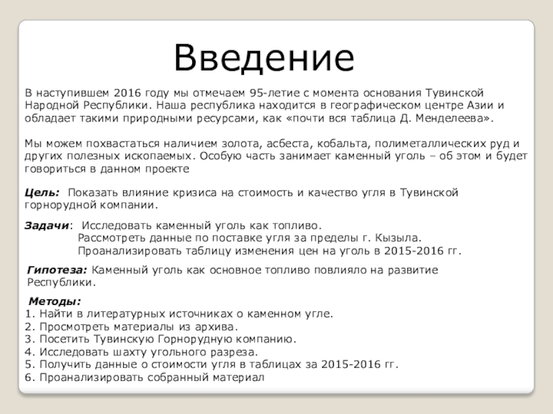 Цель: Показать влияние кризиса на стоимость и качество угля в Тувинской горнорудной компании.