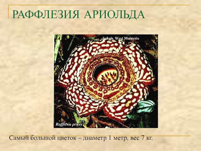 РАФФЛЕЗИЯ АРИОЛЬДАСамый большой цветок – диаметр 1 метр, вес 7 кг.