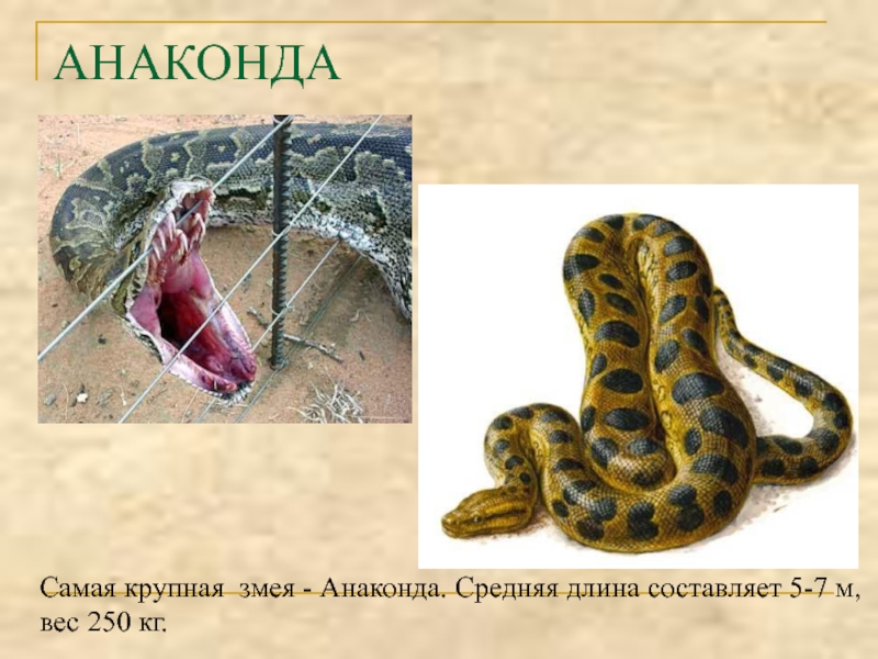АНАКОНДАСамая крупная змея - Анаконда. Средняя длина составляет 5-7 м, вес 250 кг.
