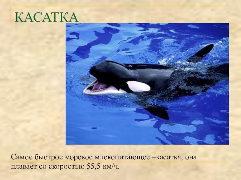 КАСАТКАСамое быстрое морское млекопитающее –касатка, она плавает со скоростью 55,5 км/ч.