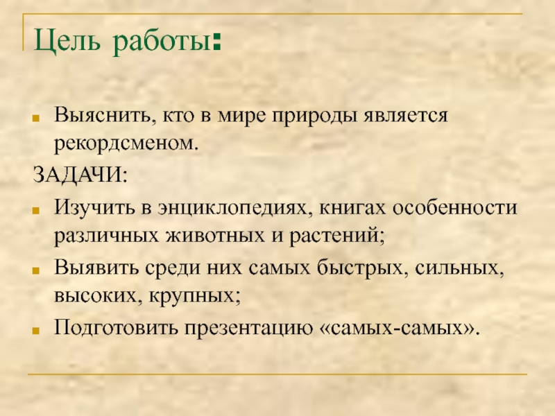 Цель работы:Выяснить, кто в мире природы является рекордсменом.ЗАДАЧИ:Изучить в энциклопедиях, книгах особенности различных животных и растений;Выявить среди них самых быстрых, сильных, высоких, крупных;Подготовить презентацию «самых-самых».