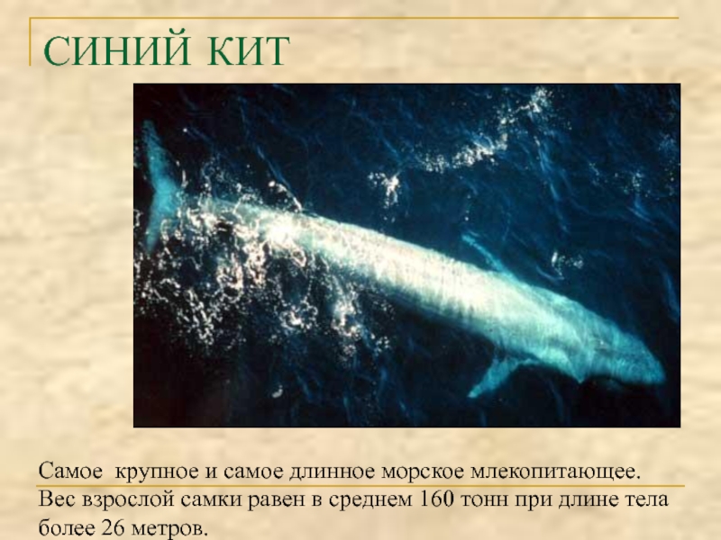 СИНИЙ КИТСамое крупное и самое длинное морское млекопитающее. Вес взрослой самки равен в среднем 160 тонн при