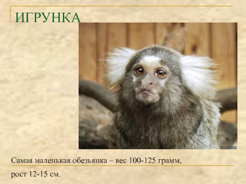 ИГРУНКАСамая маленькая обезьянка – вес 100-125 грамм, рост 12-15 см.