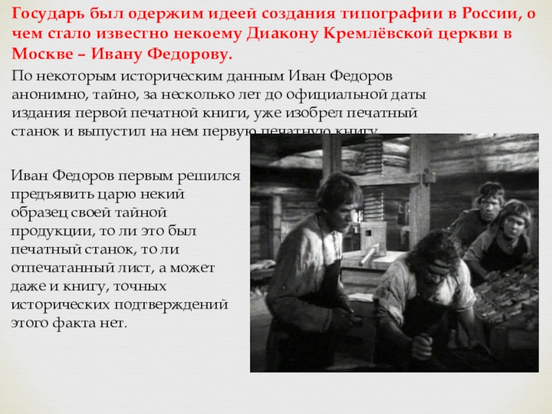 Иван Федоров первым решился предъявить царю некий образец своей тайной продукции, то ли это был печатный станок, то ли отпечатанный лист, а может даже и книгу, точных исторических подтверждений этого факта нет.