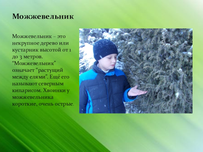3 метров. “Можжевельник” означает “растущий между елями”. Ещё его называют северным кипарисом. Хвоинки у можжевельника короткие, очень острые.