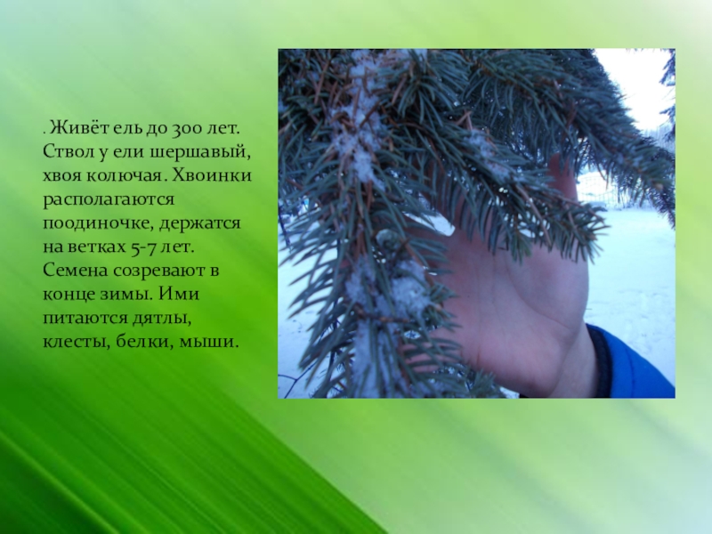 Слайд 9. Живёт ель до 300 лет. Ствол у ели шершавый, хвоя