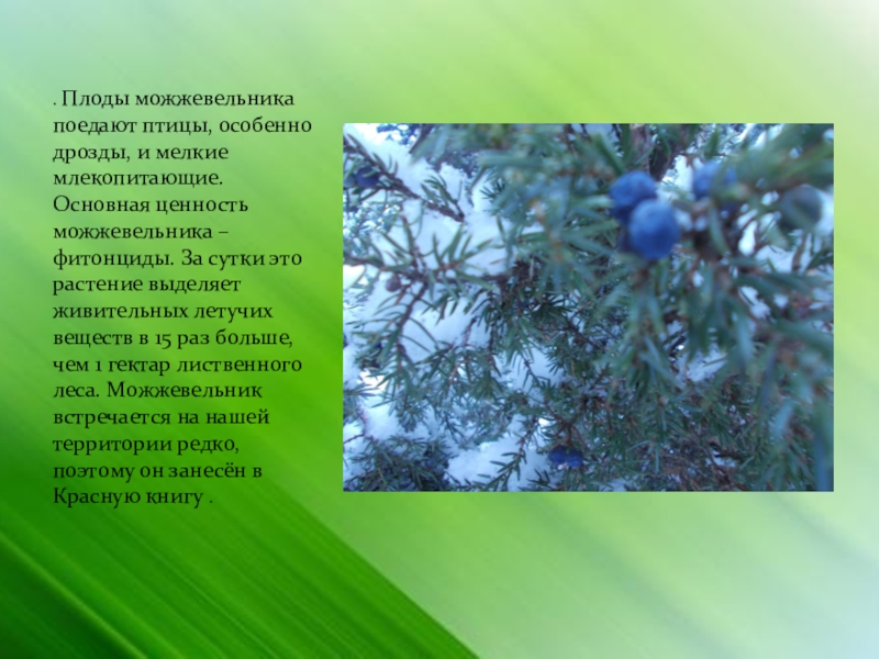 ценность можжевельника – фитонциды. За сутки это растение выделяет живительных летучих веществ в 15 раз больше, чем 1 гектар лиственного леса. Можжевельник встречается на нашей территории редко, поэтому он занесён в Красную книгу .