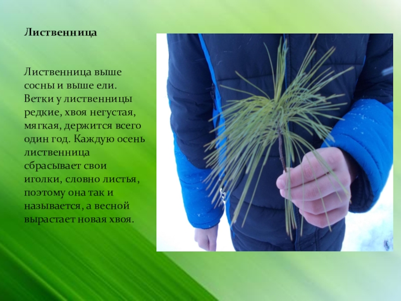 мягкая, держится всего один год. Каждую осень лиственница сбрасывает свои иголки, словно листья, поэтому она так и называется, а весной вырастает новая хвоя.