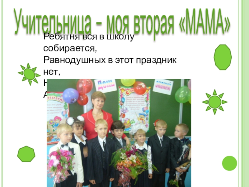 Учительница – моя вторая «МАМА»Ребятня вся в школу собирается,Равнодушных в этот праздник нет,Наш Учитель тоже улыбается,А в