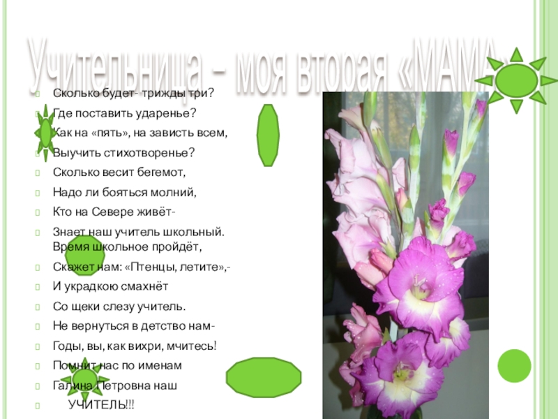 Учительница – моя вторая «МАМА»Сколько будет- трижды три?Где поставить ударенье?Как на «пять», на зависть всем,Выучить стихотворенье?Сколько весит