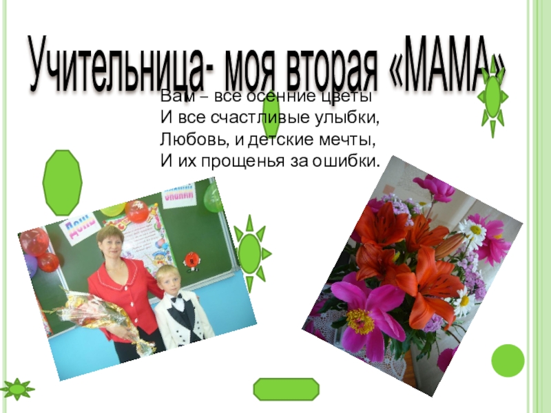 Учительница- моя вторая «МАМА»Вам – все осенние цветыИ все счастливые улыбки,Любовь, и детские мечты,И их прощенья за