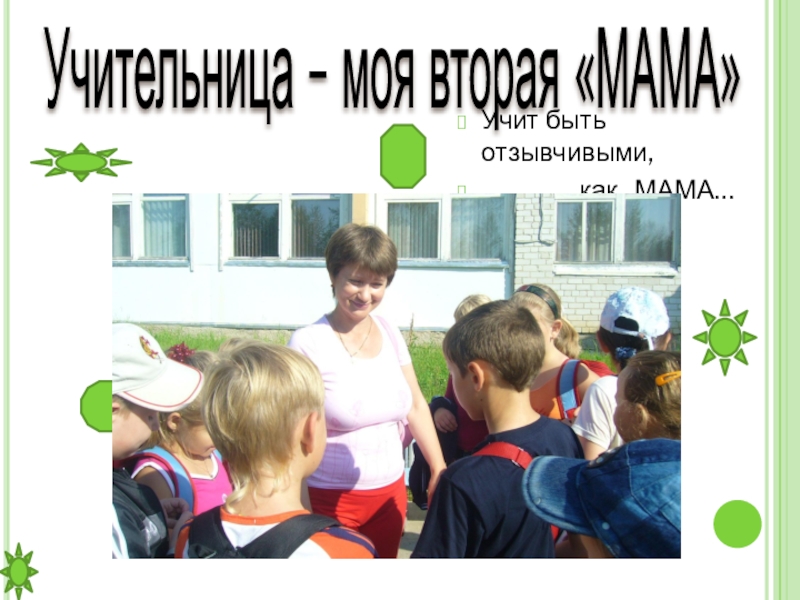 Учительница – моя вторая «МАМА»Учит быть отзывчивыми,         как