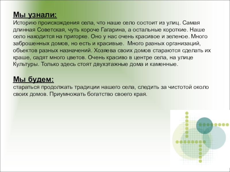 стараться продолжать традиции нашего села, следить за чистотой около своих домов. Приумножать богатство своего края.