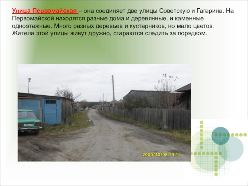 Первомайской находятся разные дома и деревянные, и каменные одноэтажные. Много разных деревьев и кустарников, но мало цветов. Жители этой улицы живут дружно, стараются следить за порядком.
