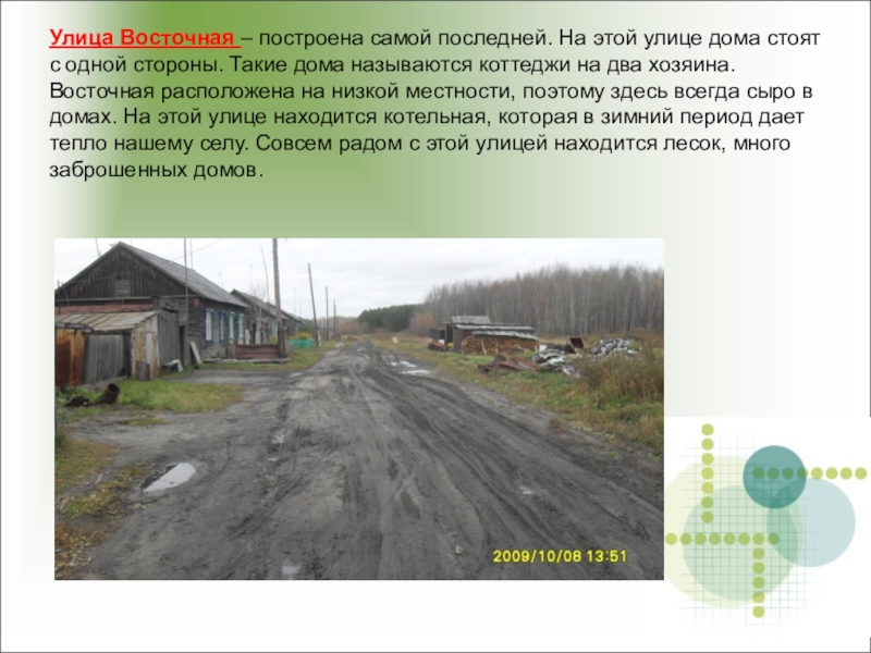 с одной стороны. Такие дома называются коттеджи на два хозяина. Восточная расположена на низкой местности, поэтому здесь всегда сыро в домах. На этой улице находится котельная, которая в зимний период дает тепло нашему селу. Совсем радом с этой улицей находится лесок, много заброшенных домов.