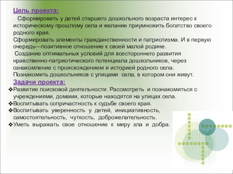 Создание оптимальных условий для всестороннего развития нравственно-патриотического потенциала дошкольников, через ознакомление с происхождением и историей родного села.