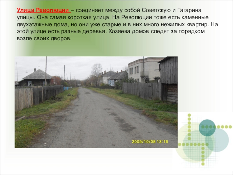 самая короткая улица. На Революции тоже есть каменные двухэтажные дома, но они уже старые и в них много нежилых квартир. На этой улице есть разные деревья. Хозяева домов следят за порядком возле своих дворов.