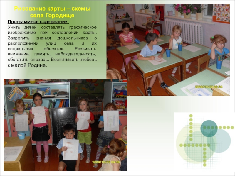 при составлении карты. Закрепить знания дошкольников о расположении улиц села и их социальных объектах. Развивать внимание, память, наблюдательность, обогатить словарь. Воспитывать любовь к малой Родине.