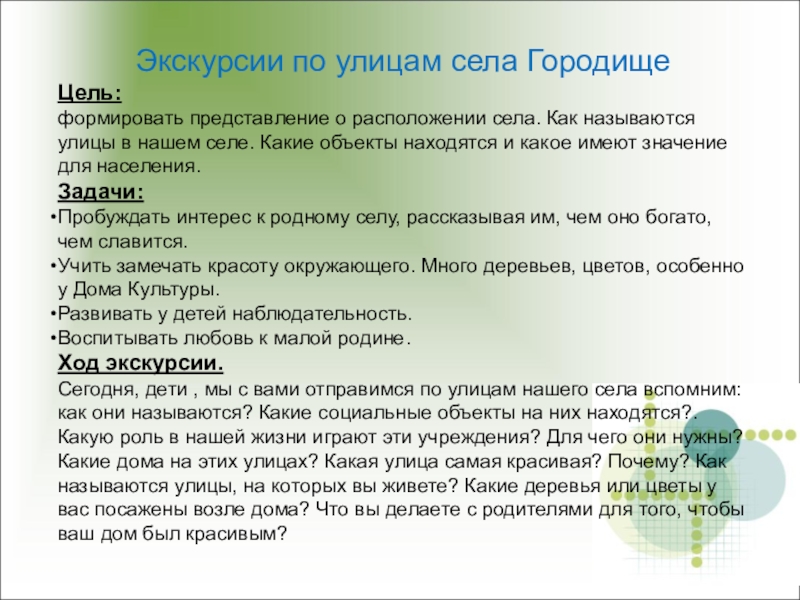 Сегодня, дети , мы с вами отправимся по улицам нашего села вспомним: как они называются? Какие социальные объекты на них находятся?. Какую роль в нашей жизни играют эти учреждения? Для чего они нужны? Какие дома на этих улицах? Какая улица самая красивая? Почему? Как называются улицы, на которых вы живете? Какие деревья или цветы у вас посажены возле дома? Что вы делаете с родителями для того, чтобы ваш дом был красивым?