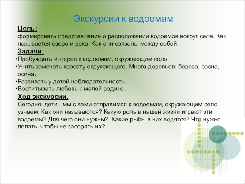 Сегодня, дети , мы с вами отправимся к водоемам, окружающим село узнаем: Как они называются? Какую роль в нашей жизни играют эти водоемы? Для чего они нужны? Какие рыбы в них водятся? Что нужно делать, чтобы не засорять их?