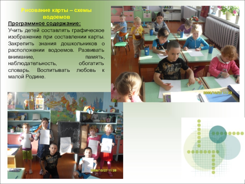 составлении карты. Закрепить знания дошкольников о расположении водоемов. Развивать внимание, память, наблюдательность, обогатить словарь. Воспитывать любовь к малой Родине.