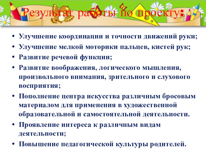 Результат работы по проекту: Улучшение координации и точности движений руки;Улучшение мелкой моторики пальцев, кистей рук;Развитие речевой функции;Развитие