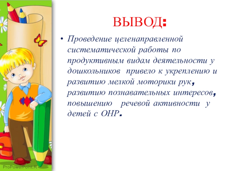 ВЫВОД:Проведение целенаправленной систематической работы по продуктивным видам деятельности у дошкольников привело к укреплению и развитию мелкой моторики