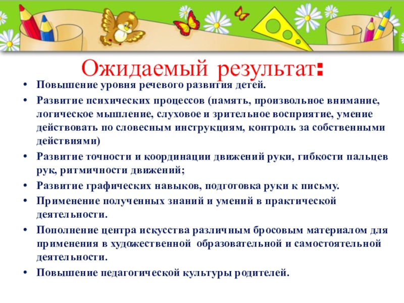 Ожидаемый результат: Повышение уровня речевого развития детей. Развитие психических процессов (память, произвольное внимание, логическое мышление, слуховое и зрительное восприятие,