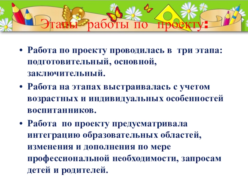 Работа по проекту предусматривала интеграцию образовательных областей, изменения и дополнения по мере профессиональной необходимости, запросам детей и родителей.
