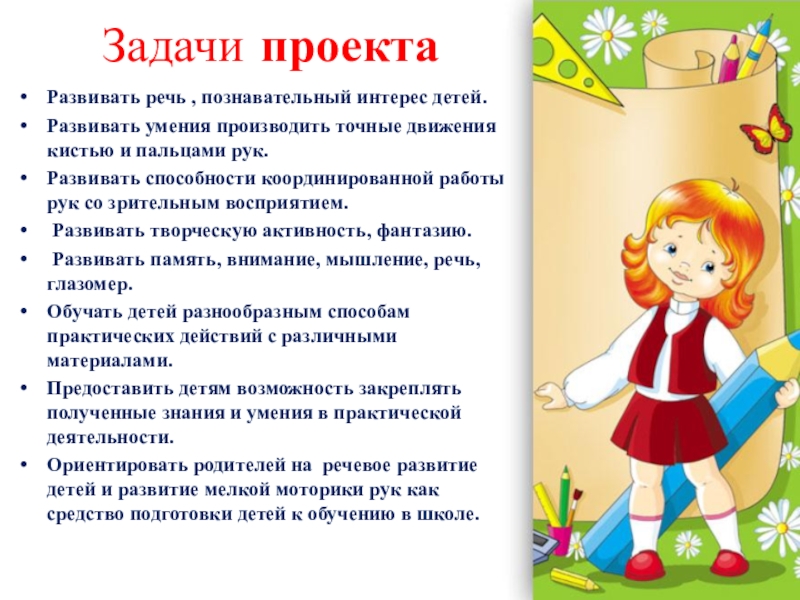 Задачи проекта Развивать речь , познавательный интерес детей.Развивать умения производить точные движения кистью и пальцами рук.Развивать способности координированной работы рук