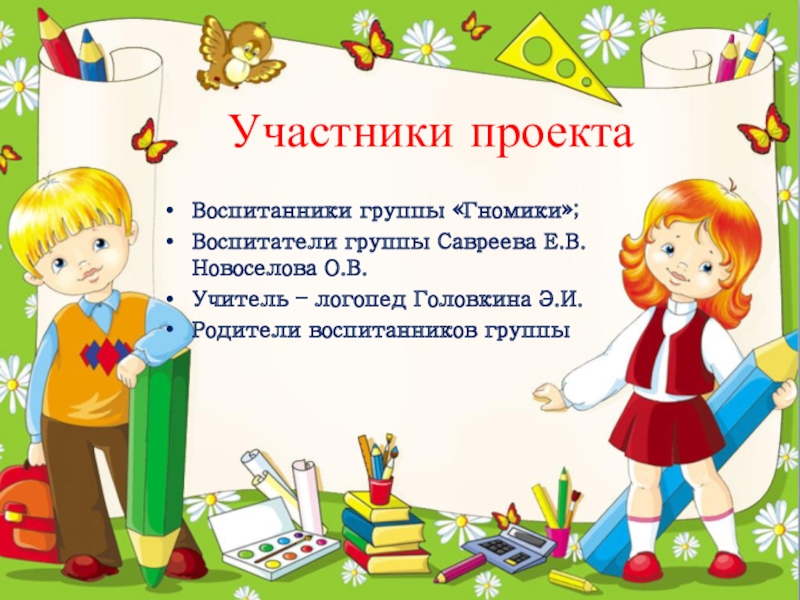 Участники проектаВоспитанники группы «Гномики»;Воспитатели группы Савреева Е.В. Новоселова О.В.Учитель – логопед Головкина Э.И.Родители воспитанников группы