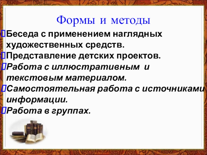 Формы и методыБеседа с применением наглядных художественных средств.Представление детских проектов.Работа с иллюстративным и текстовым материалом. Самостоятельная работа