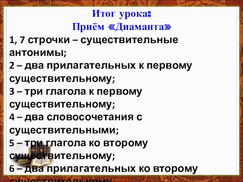 Итог урока: Приём «Диаманта»1, 7 строчки – существительные антонимы;2 – два прилагательных к первому существительному;3 – три