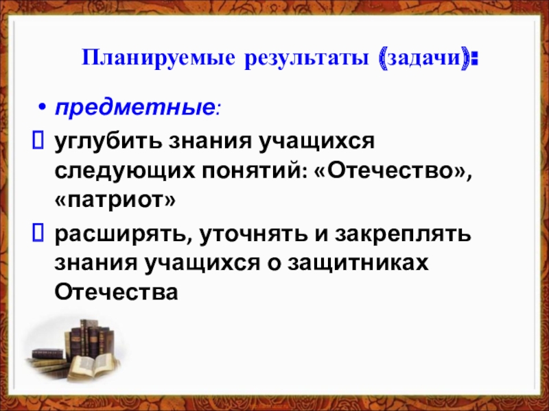 Планируемые результаты (задачи):предметные:углубить знания учащихся следующих понятий: «Отечество», «патриот»расширять, уточнять и закреплять знания учащихся о защитниках Отечества