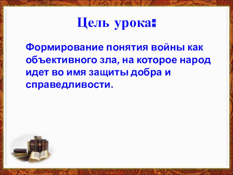 Цель урока:Формирование понятия войны как объективного зла, на которое народ идет во имя защиты добра и справедливости.