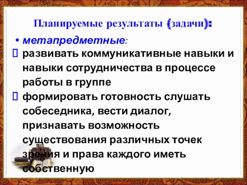 Планируемые результаты (задачи):метапредметные:развивать коммуникативные навыки и навыки сотрудничества в процессе работы в группеформировать готовность слушать собеседника, вести