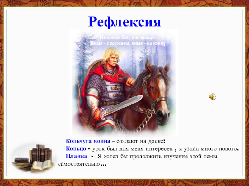 РефлексияКольчуга воина - создают на доске:Кольцо - урок был для меня интересен , я узнал много нового.Планка