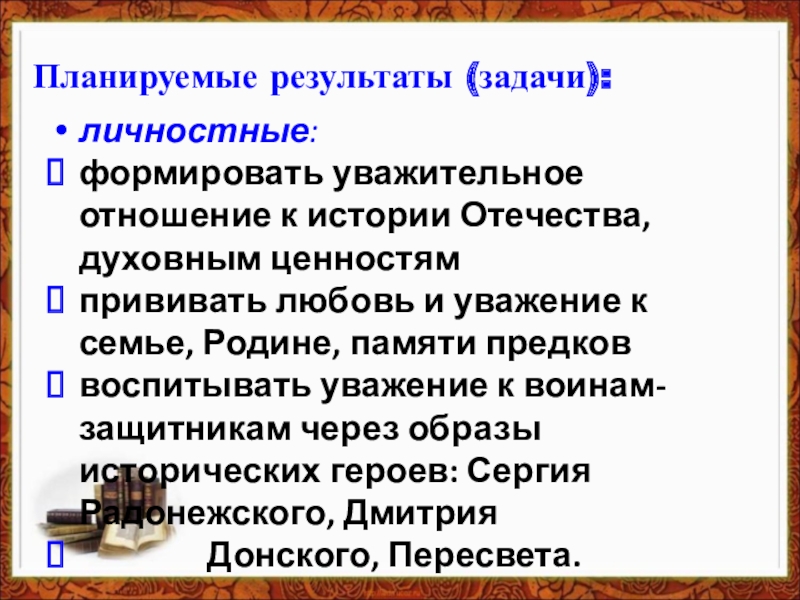 Планируемые результаты (задачи):личностные:формировать уважительное отношение к истории Отечества, духовным ценностямпрививать любовь и уважение к семье, Родине, памяти